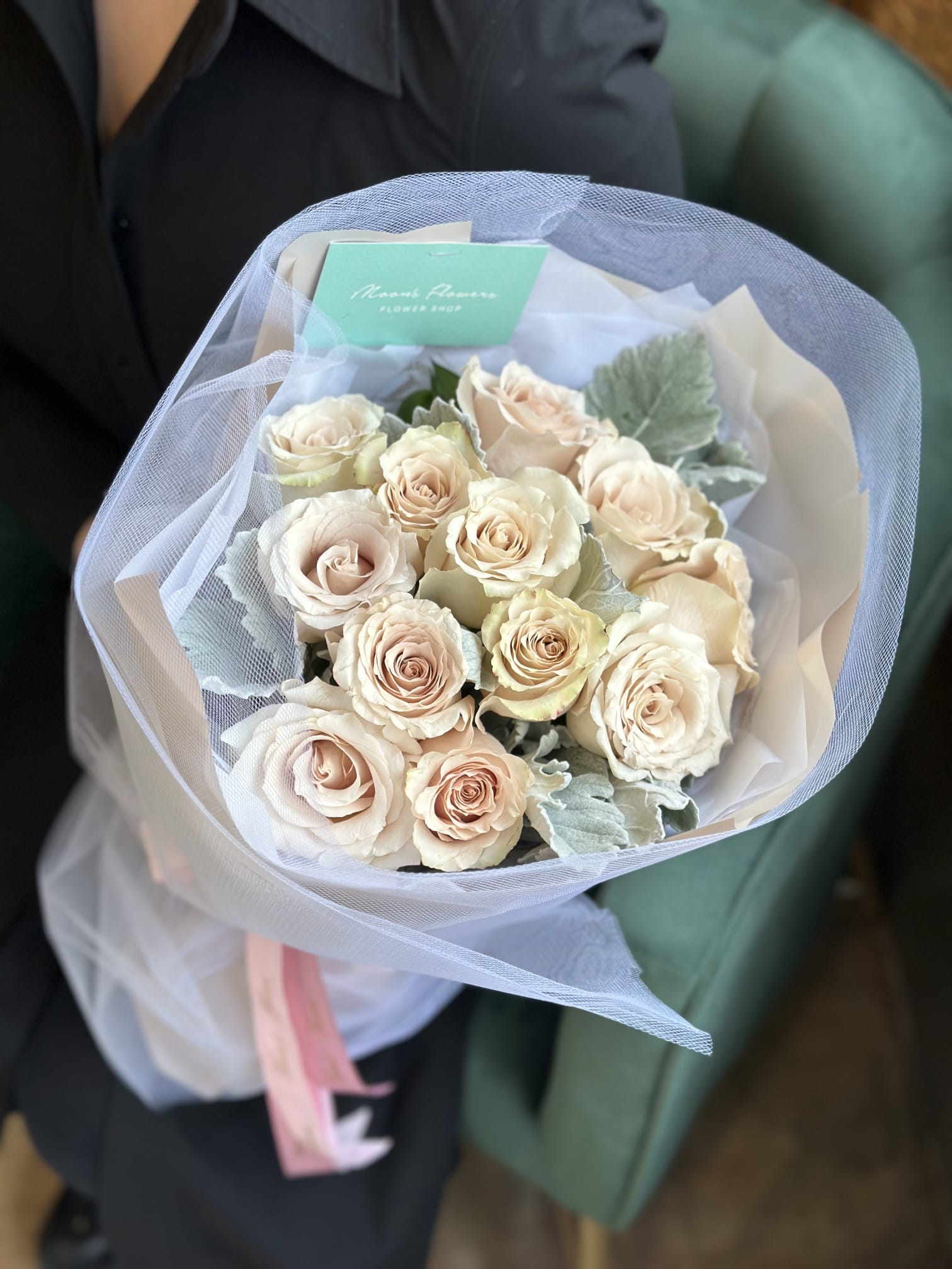 Each rose is a carefully selected spectacle of beauty, their creamy hues reminiscent of the most exquisite champagne.