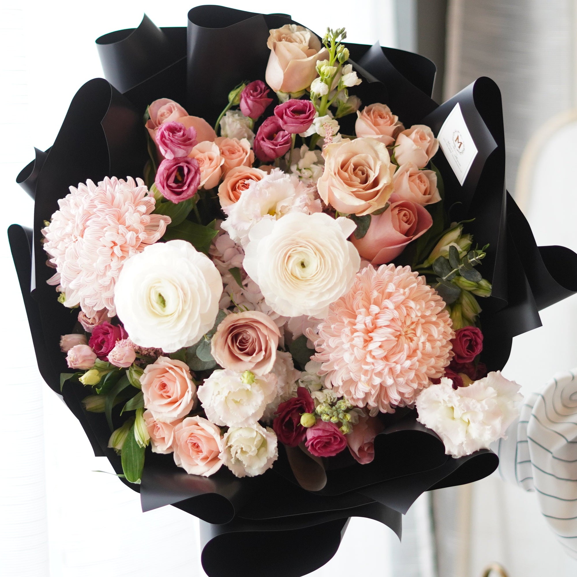 This bouquet exudes elegance with its delicate blend of creamy white and soft pink roses, interspersed with hints of peach and subtle greenery. The blooms are artfully arranged in a luxurious black wrapping, accented with sophisticated ribbons, creating a chic and romantic presentation perfect for a signature gift. Each rose appears fresh and carefully selected, promising to convey a message of grace and affection.