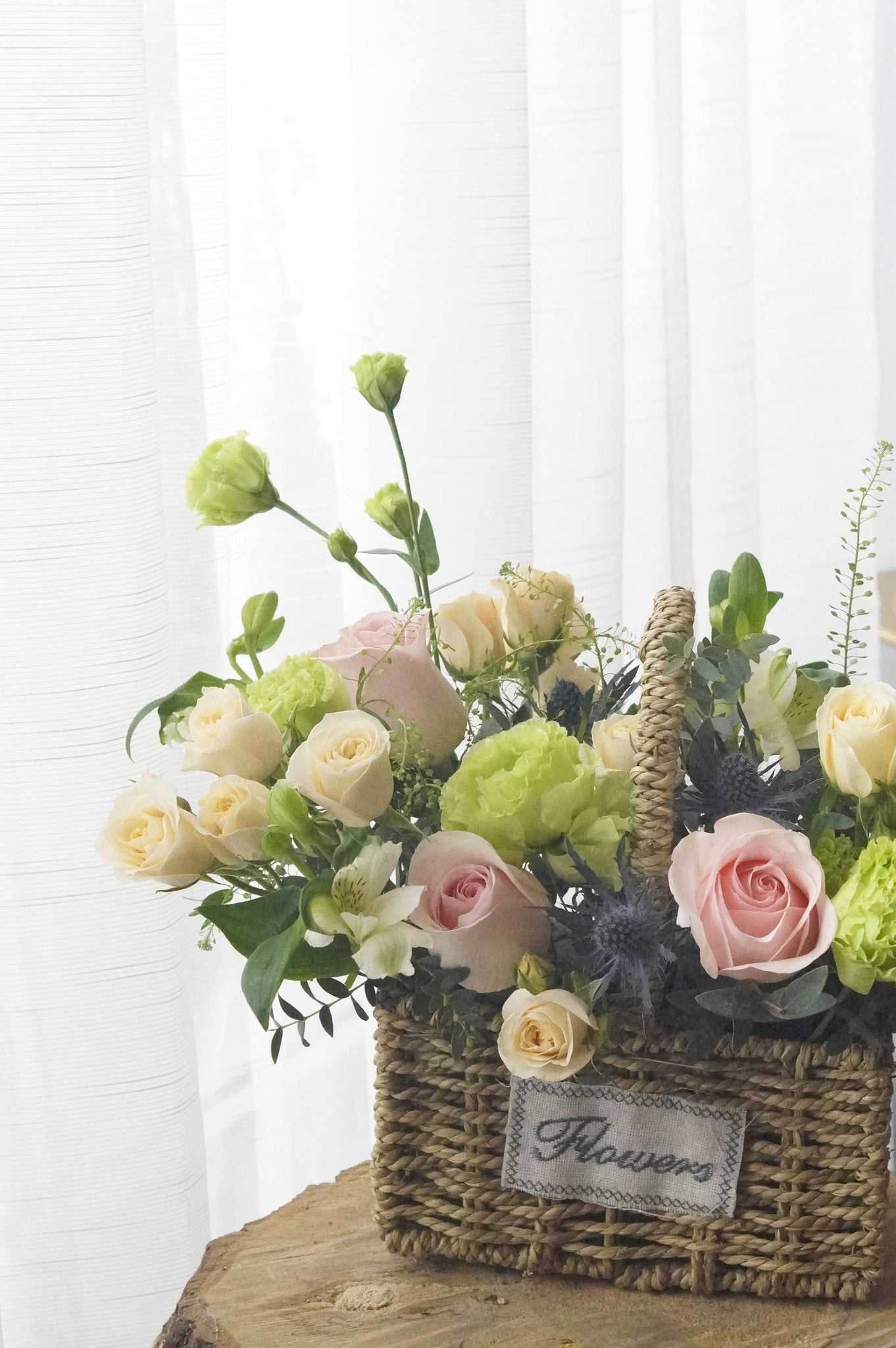 Spring in a Basket is a mix of roses, eucalyptus and a variety of other flowers that compliment one another to remind you of spring. It uses a soft but vibrant colour palette of pinks, beiges, greens, and blues, and creates volume by arrangement of the stems.