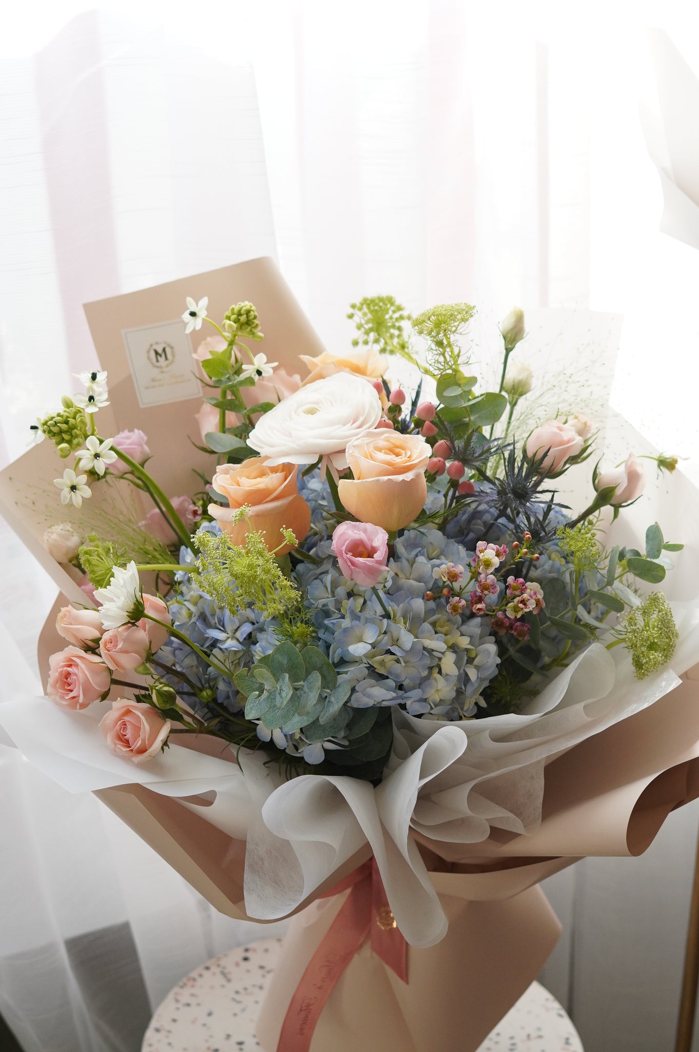 이 부케의 중앙에는 수국이 장식되어 있으며, 우아함과 세련미가 물씬 풍기는 볼륨감 넘치는 꽃잎을 자랑합니다. 파란색, 분홍색, 샴페인의 매혹적인 색조가 나머지 배열의 그림 같은 배경을 형성합니다.