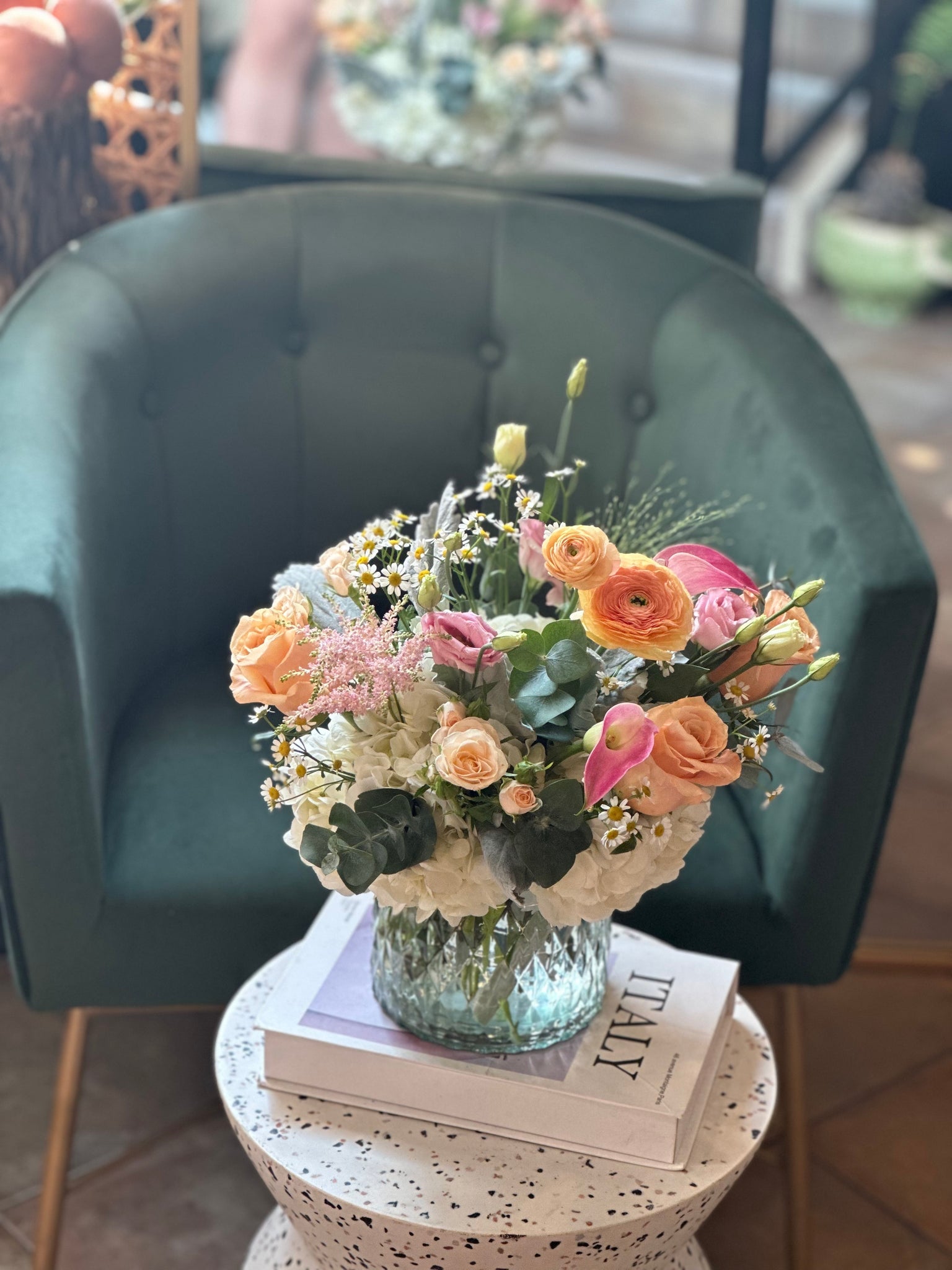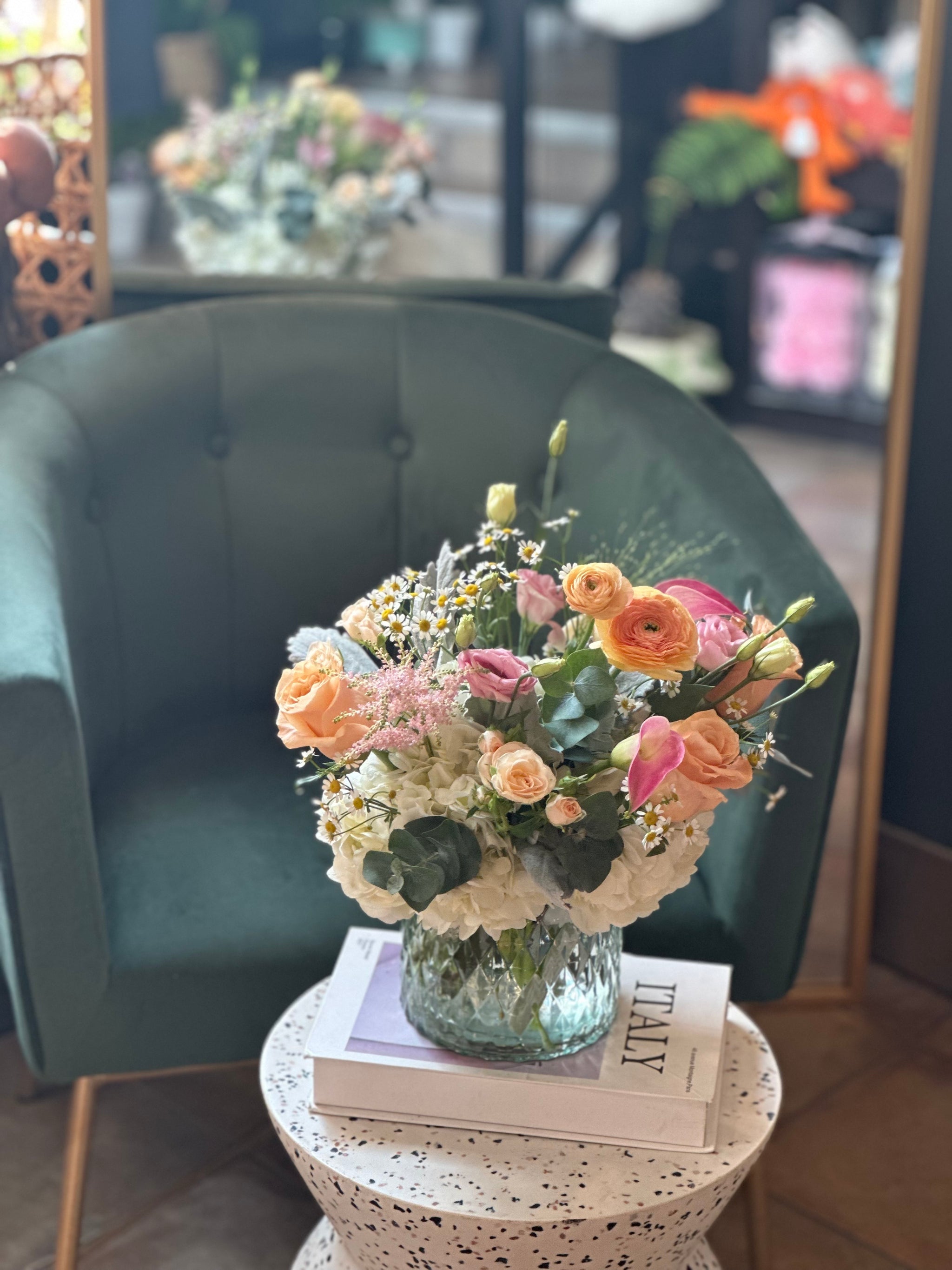 All of our bouquets are florist-designed, and while each arrangement is unique, we always aim to match the style and color palette shown.