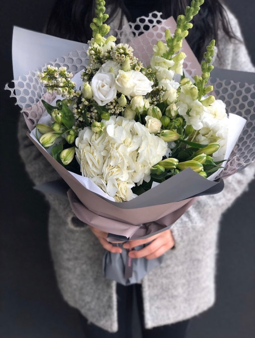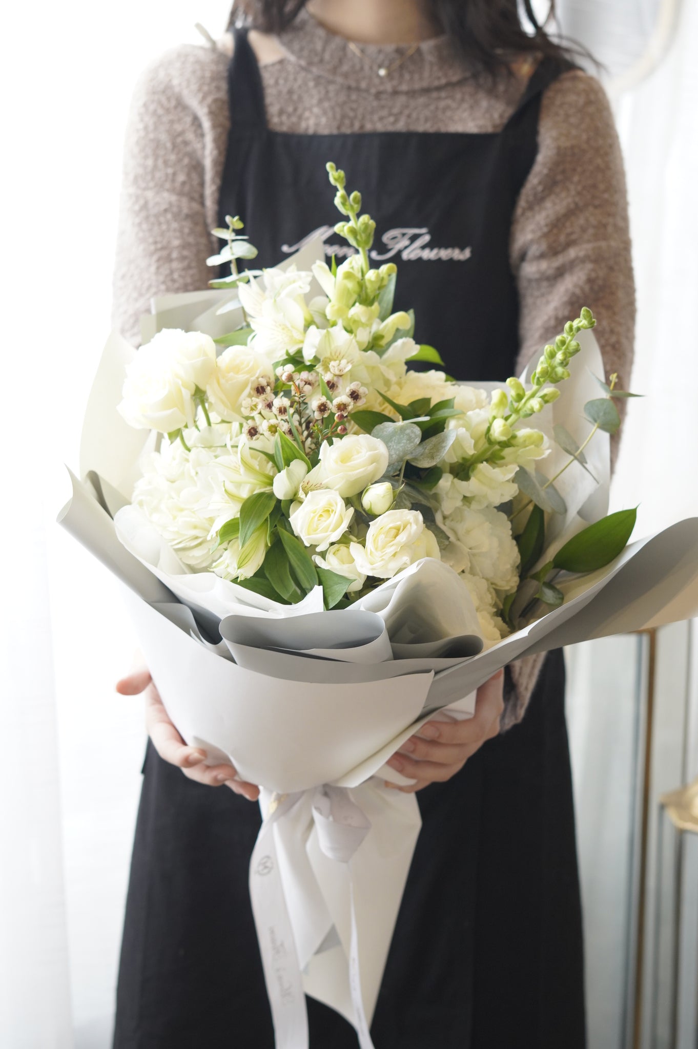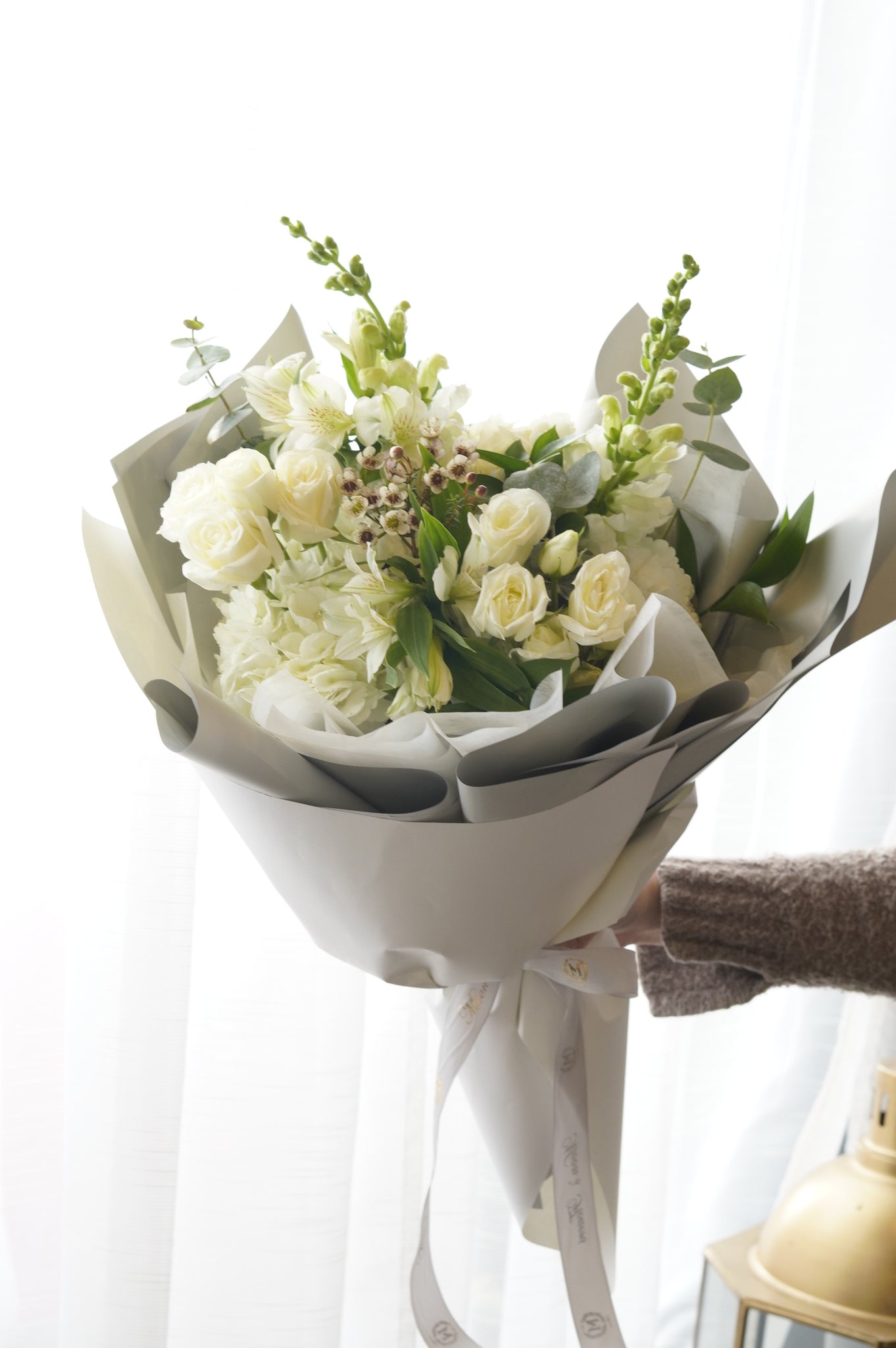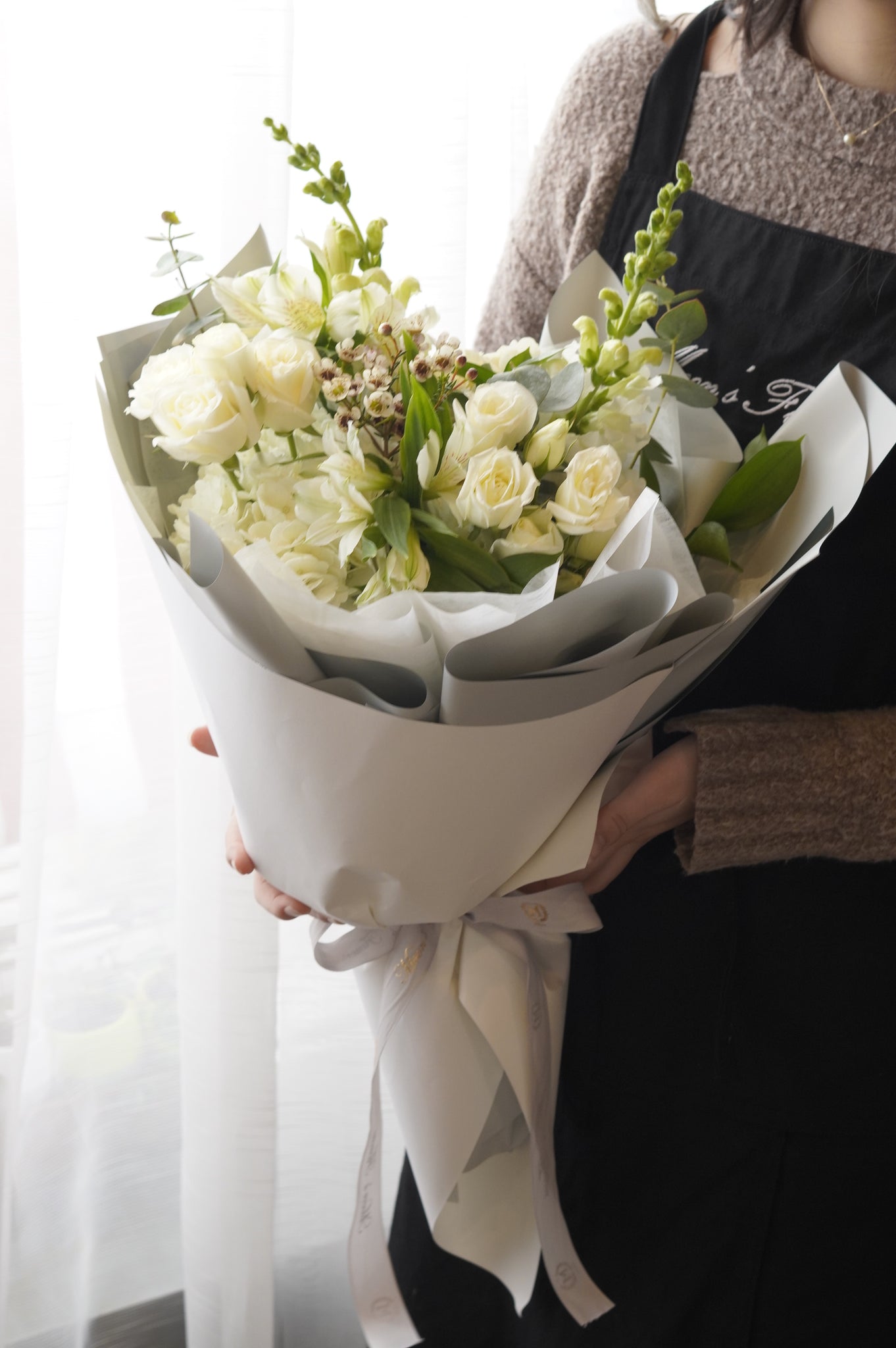 손으로 묶은 꽃다발은 당사의 시그니처 포장 방식으로 포장되며, 줄기 부분은 워터백에 담겨 배송됩니다.
