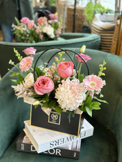 이 절묘한 꽃 바구니는 섬세한 색상과 세련된 디자인의 조화입니다. 그 중심에는 장엄한 국화가 자리잡고 있으며, 꽃잎은 부드러운 핑크색 장미와 스프레이 장미의 부드러운 로맨스로 둘러싸여 있습니다.