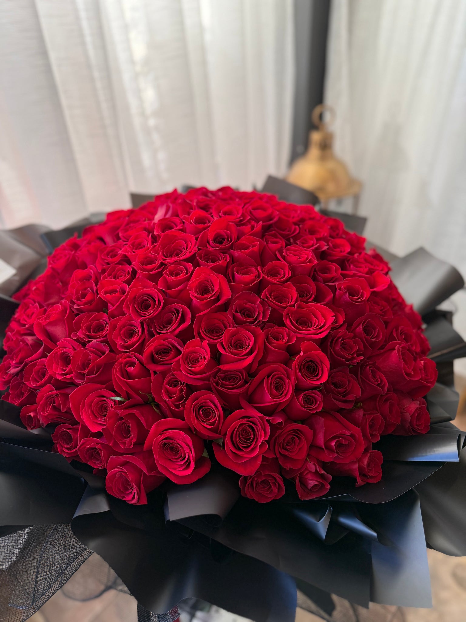 Featuring 100 premium roses arranged in a lush, full bouquet, this design symbolizes deep love, admiration, and celebration.