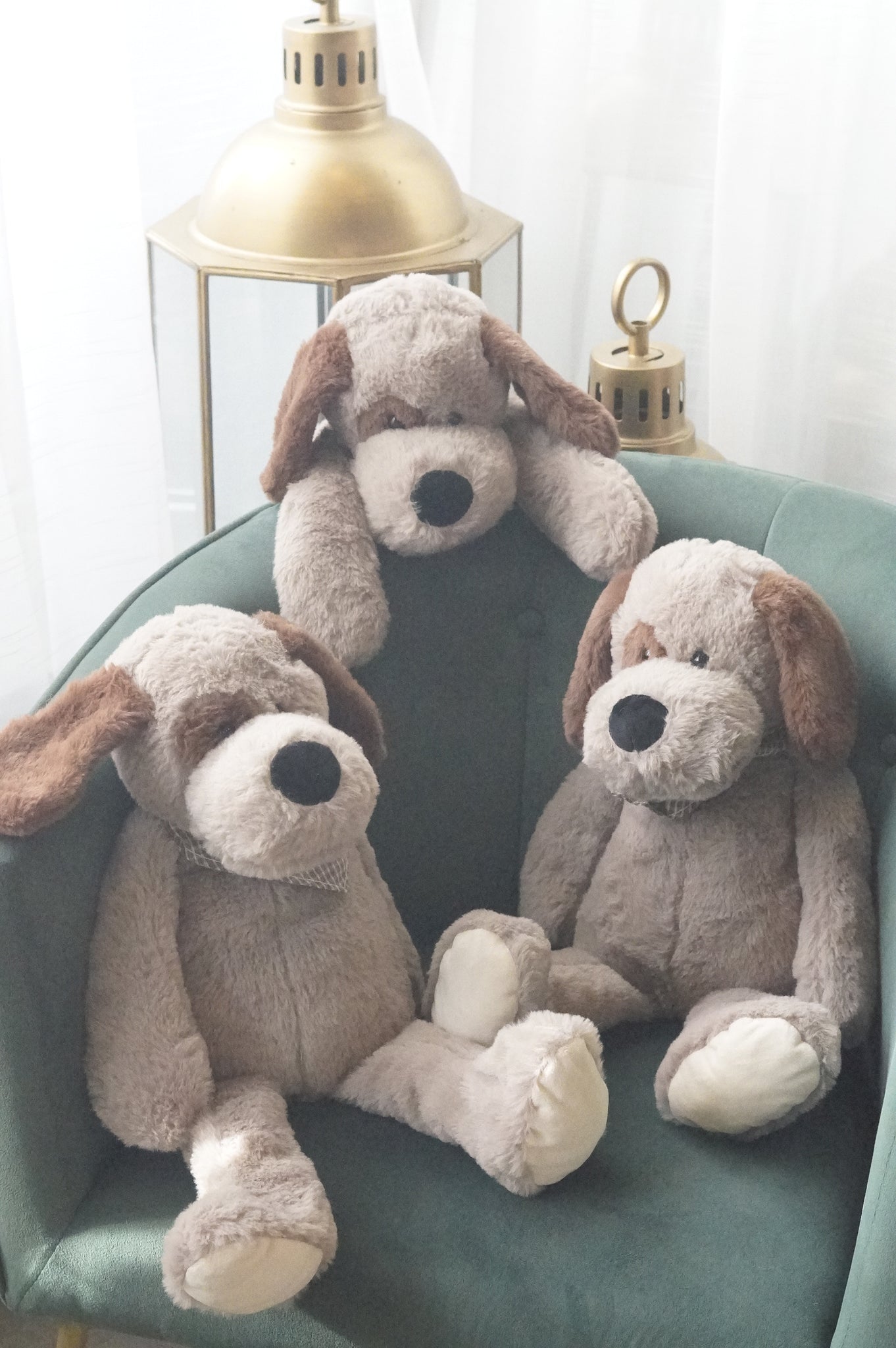 Cuddle up with our adorable Toffee dog! Toffee dog is toasty brown color bundled up with an adorable tartan scarf with pom pom accents.