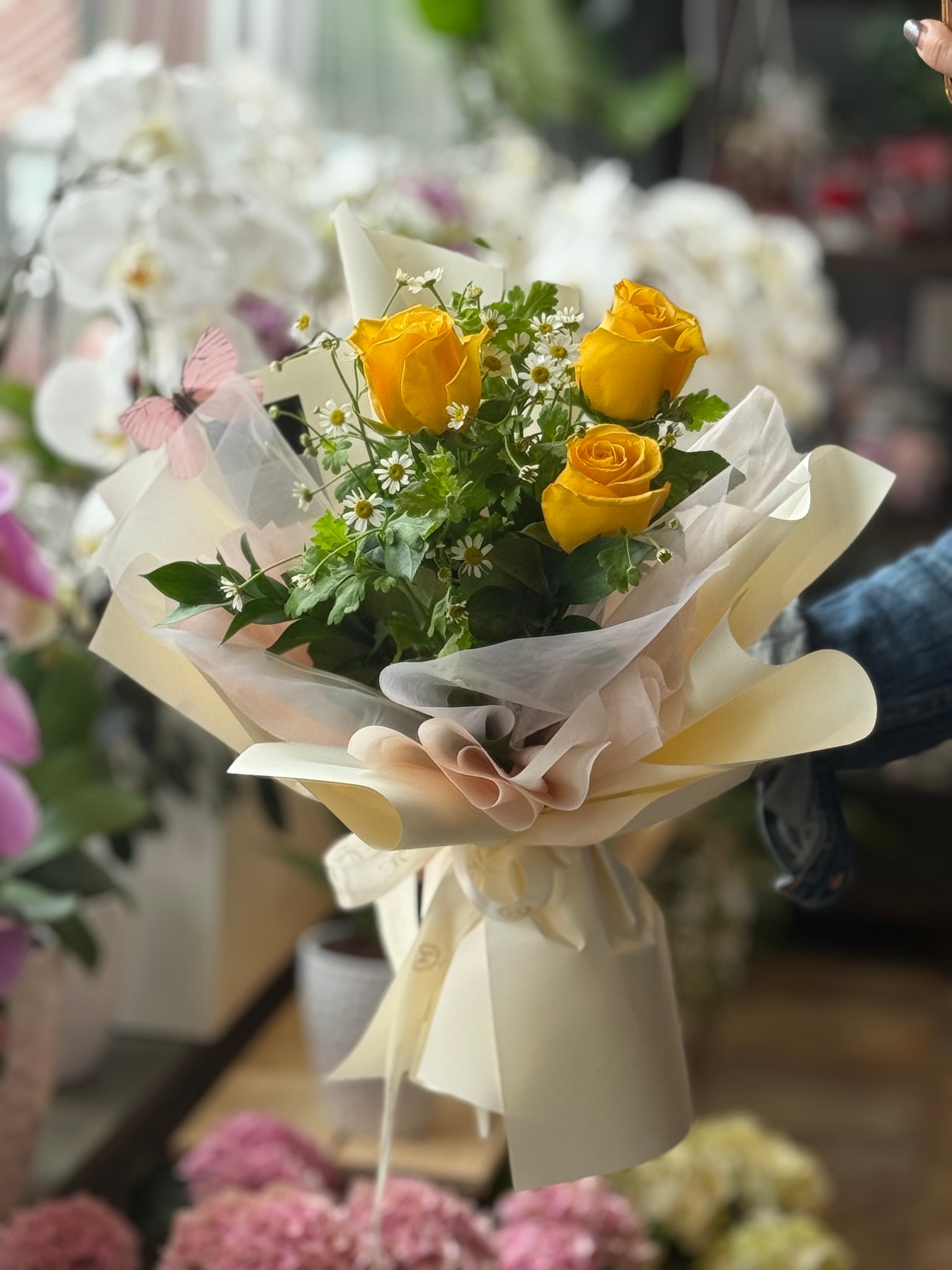 Gift a timeless expression of romance with our 3 Roses Bouquet. Each bouquet features three premium roses in a large choice of stunning colours, which is complimented with seasonal and delicate filler flowers that add texture and depth. Every bouquet is expertly wrapped with Moon's Flowers signature wrapping style, making it the perfect balnce between casual charm and heartfelt sentiment. Ideal for anniversaries, apologies, or simply saying "I'm thinking of you," this classic design delivers maximum impact with refined simplicity.