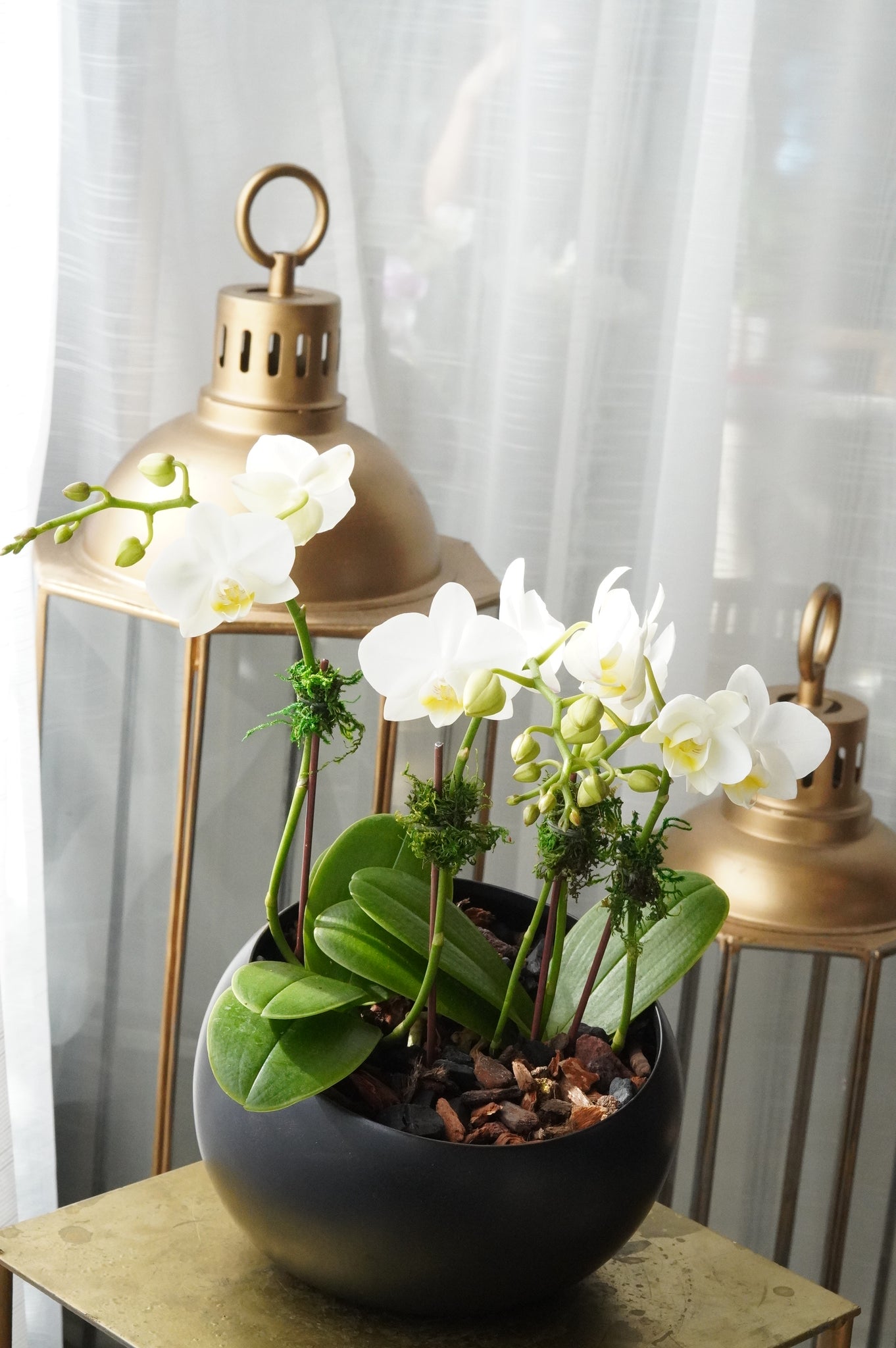 随着迷你兰花的生长,您可能需要给它换盆。您甚至可以将它放入已有的盆中,盆中还种有全尺寸的兰花(如果有空间的话)。这样可以创造出美观的大型和小型花朵组合。