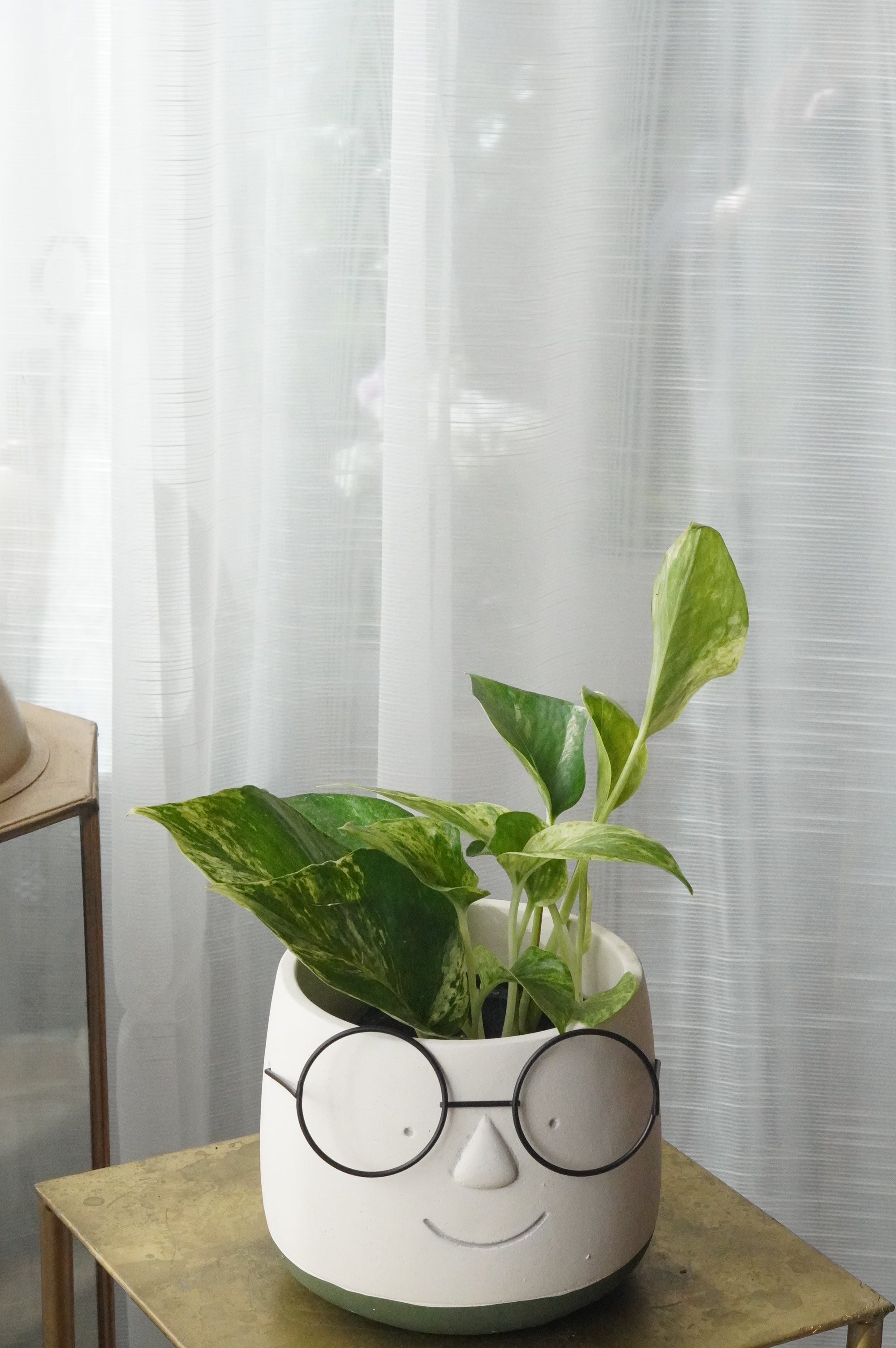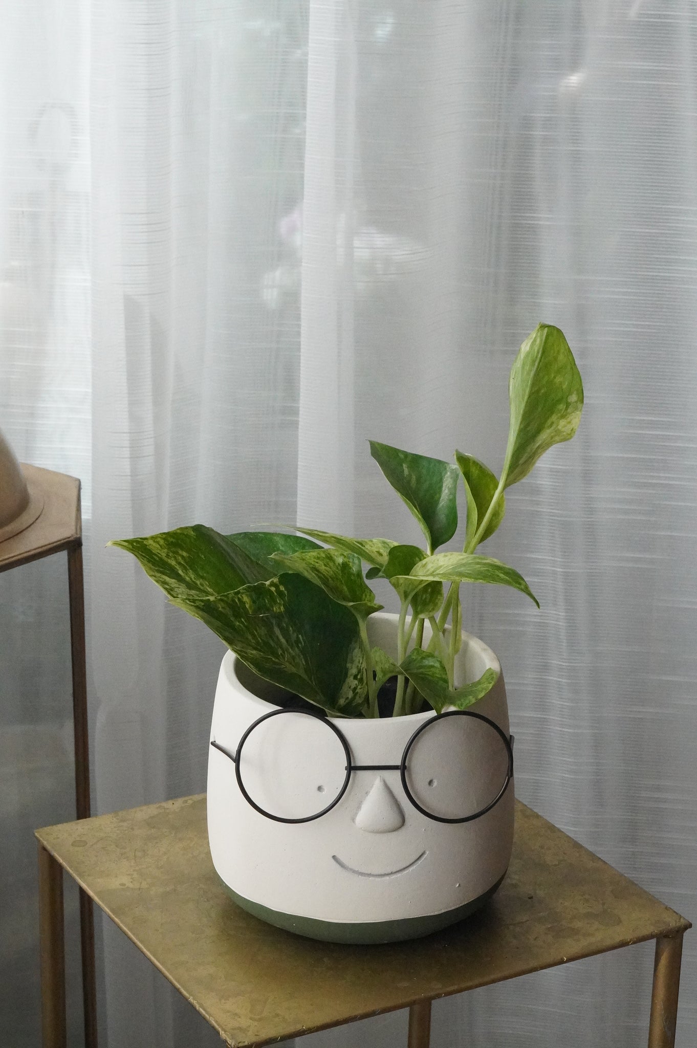 Bring happiness and personality into your space with our Mr. Green Glasses planter. This charming ceramic pot features a friendly smiling face and round metal glasses, giving it a playful and warm personality. Planted with a healthy Golden Pothos, this piece adds a touch of greenery that is easy to care for and thrives in most indoor environments.
