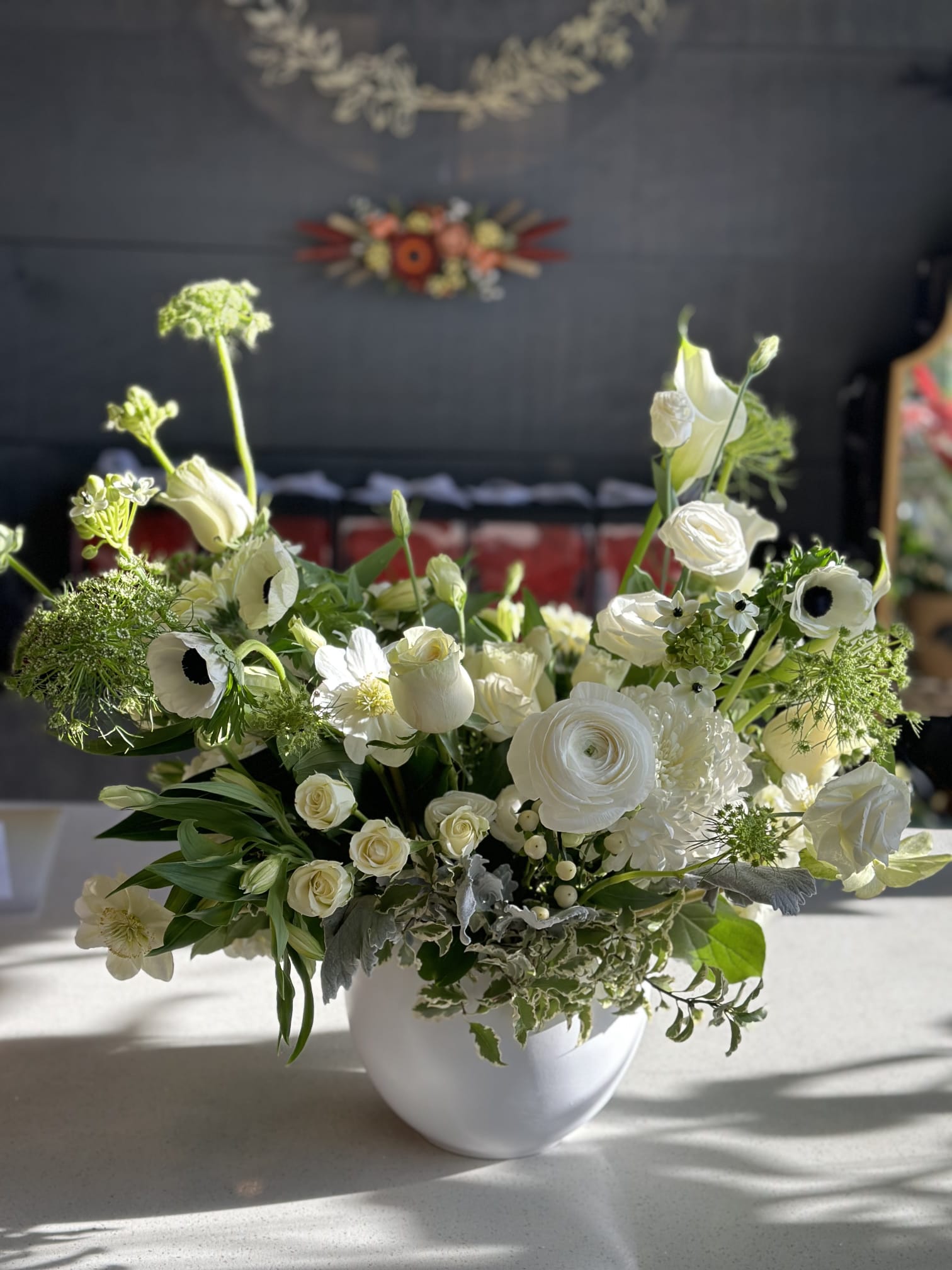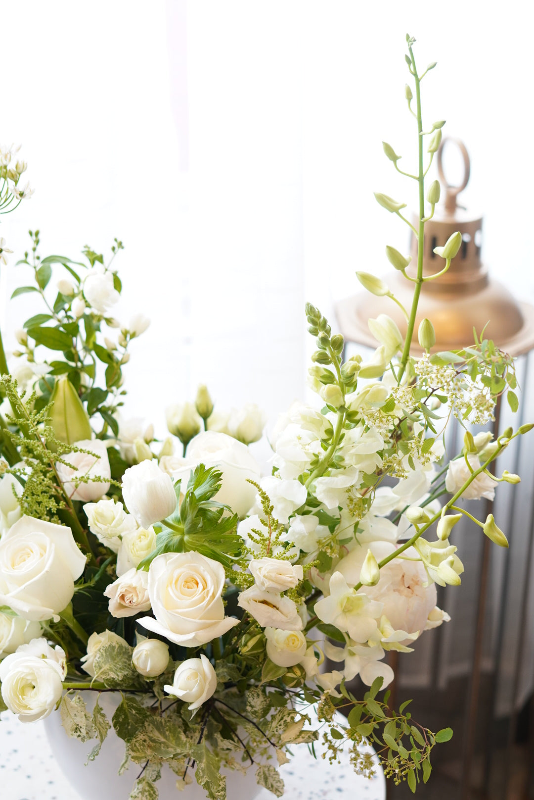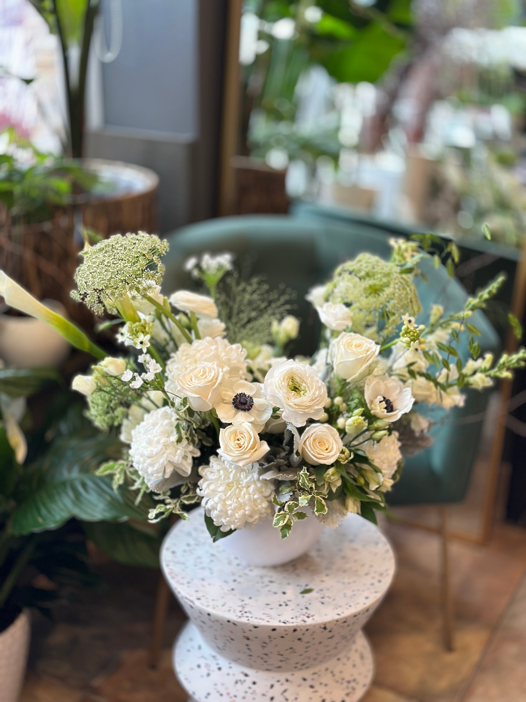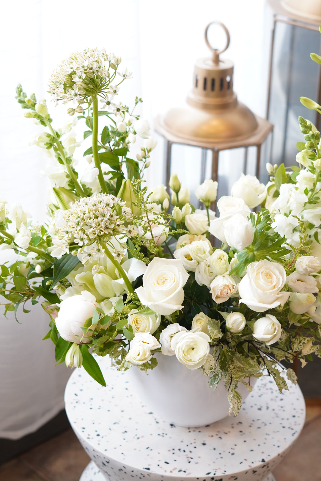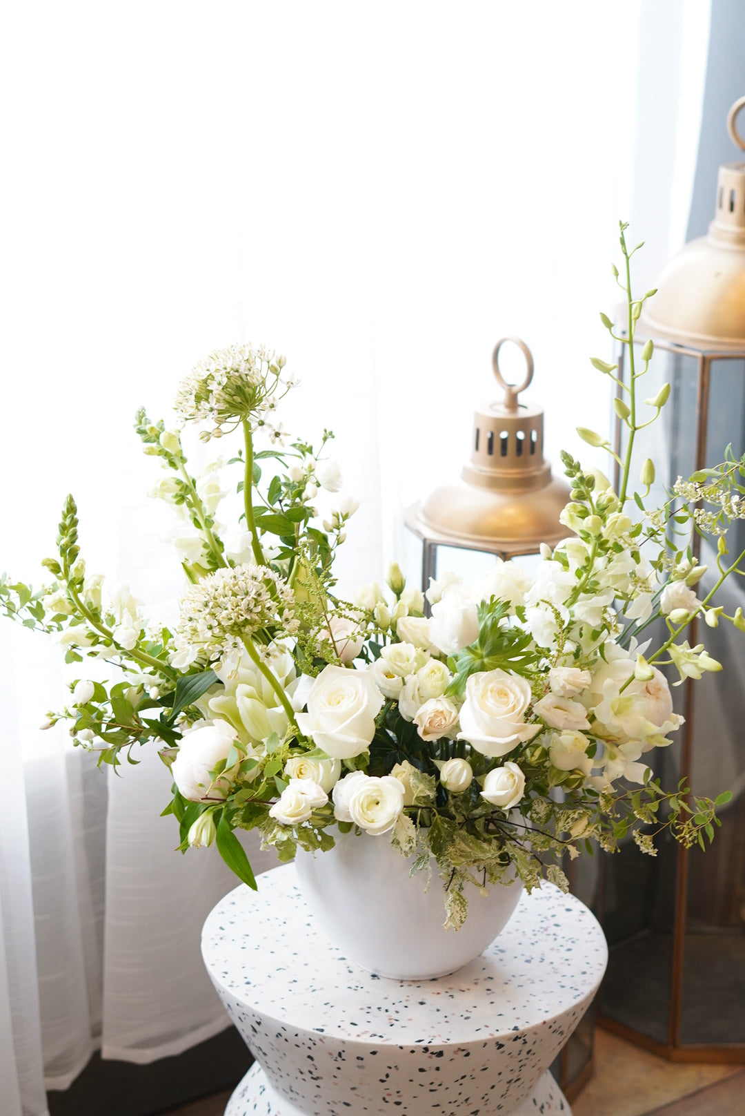 茂盛的玫瑰、优雅的百合以及精致的季节性花卉被温柔地拥入经典的白色容器中,给人一种柔和舒适的感觉。